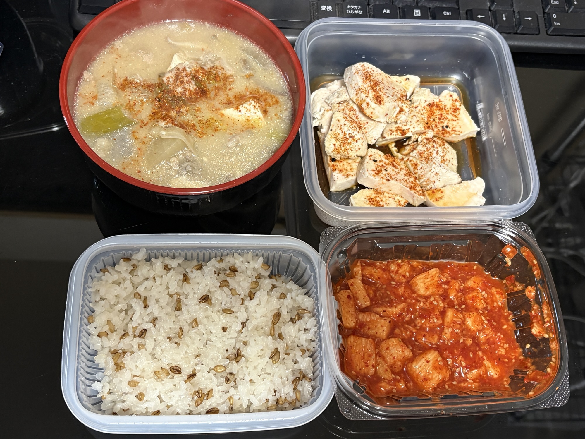 - 内容:バーリーマックスご飯200g、豚汁、塩茹で鶏むね肉200g、長芋キムチ