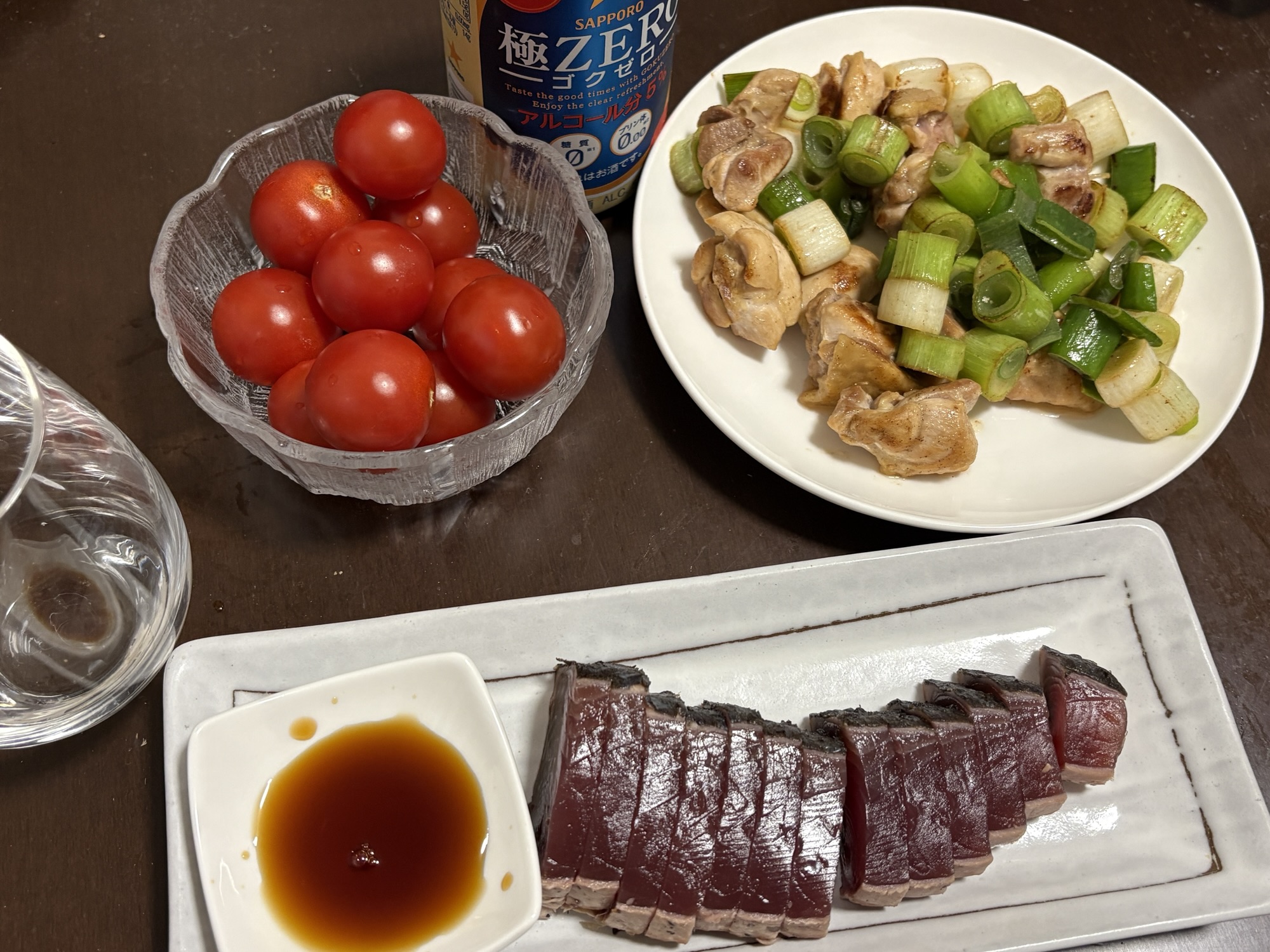 - 内容:【カツオのタタキ180g、イワシ塩茹で(可食部100g)、鶏もも皮なし150g+白ネギ1本(油なし・塩胡椒)、トマト、ポン酢、鍋底に残っていた豚汁少量】