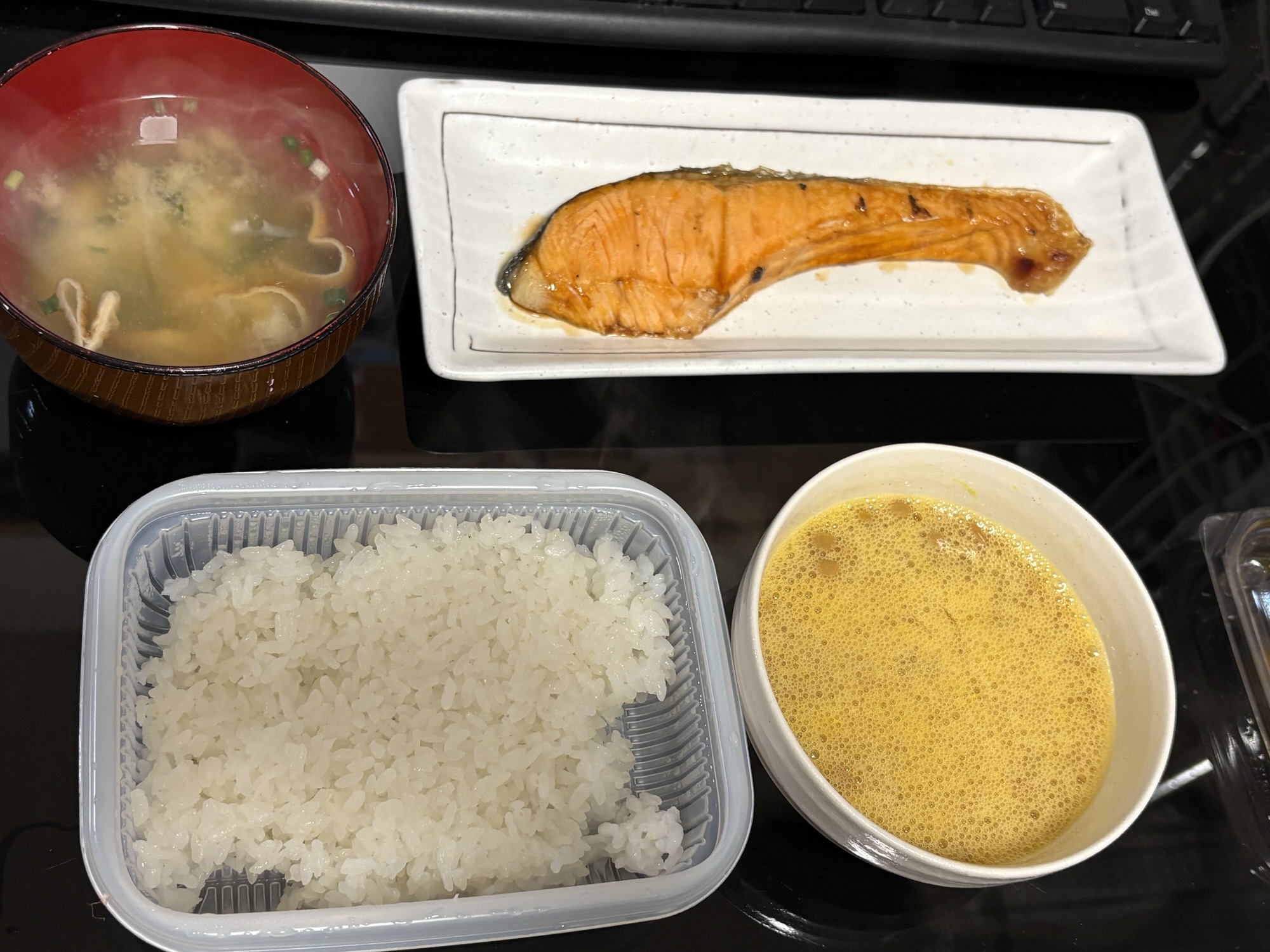 - 内容:【白ごはん150g、銀鮭90g、納豆、生卵、インスタント味噌汁】