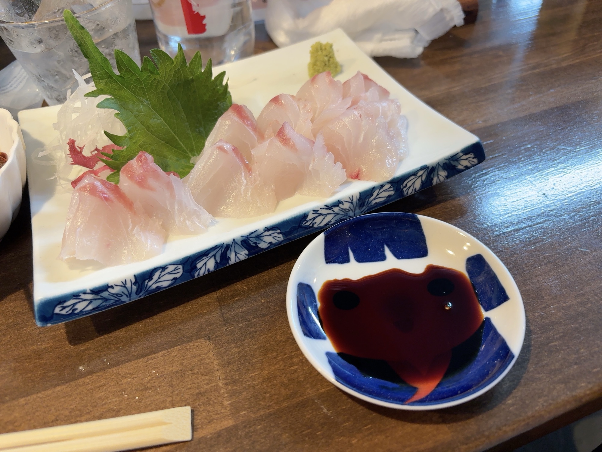 - 内容:【タイ刺身、ハタの煮付け、赤貝刺身、梅おにぎり、卵入り味噌汁】