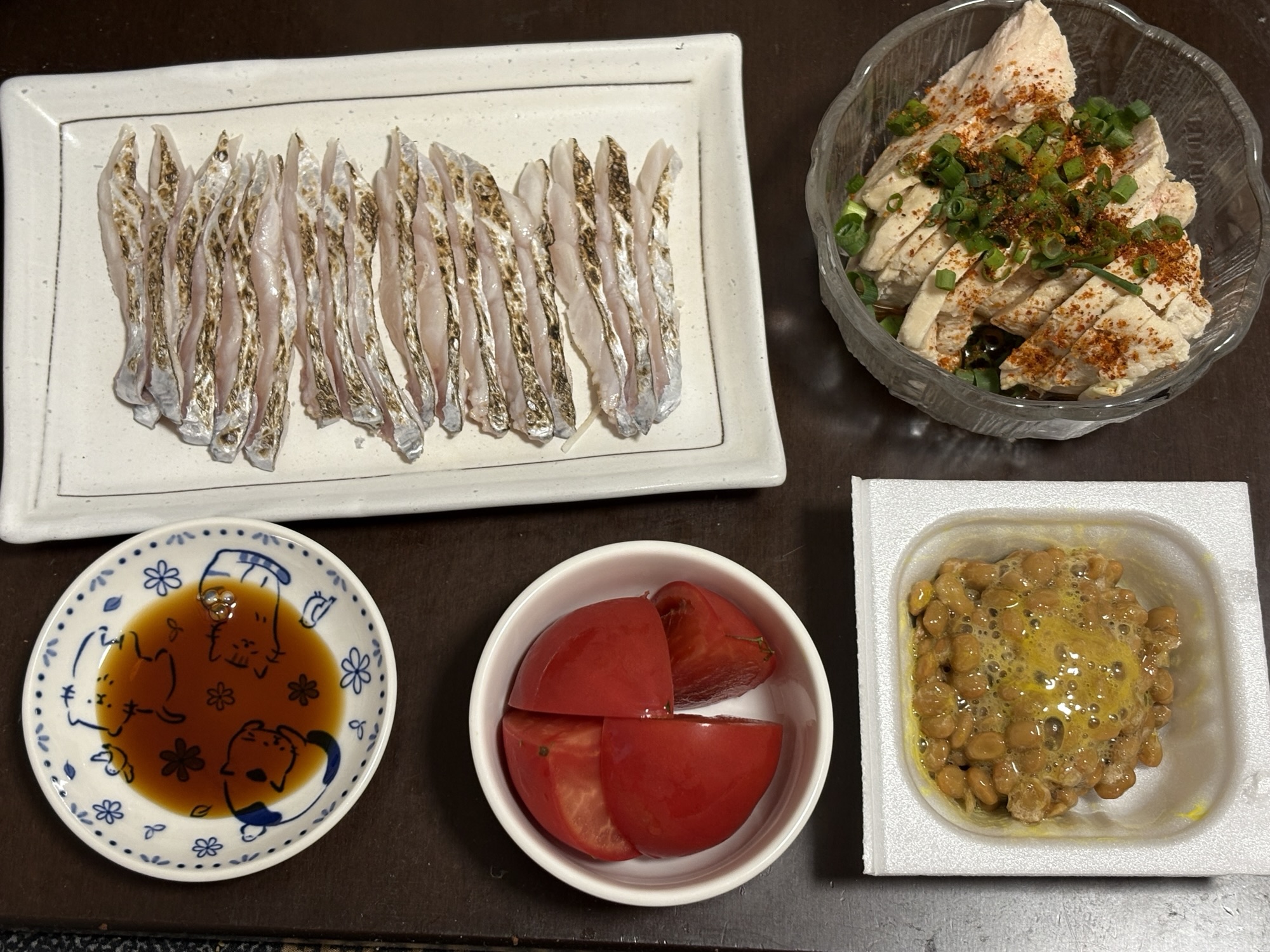 • 内容:タチウオ刺身 70g、納豆 1パック、鶏胸肉塩茹で 150g、新生姜と大葉の混ぜご飯 150g